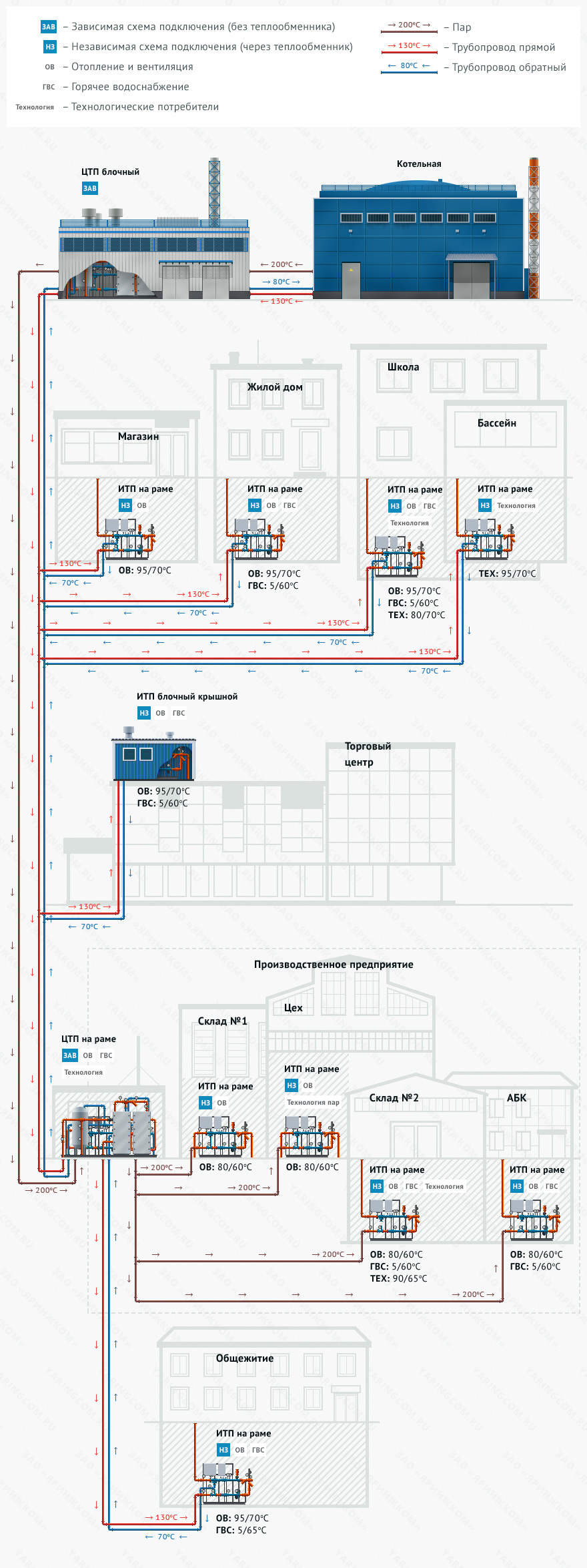 АО «Яринжком» оказывает полный комплекс услуг по проектированию тепловых пунктов (ТП) для решения задач теплоснабжения, горячего водоснабжения жилых, социальных, административных, сельскохозяйственных, производственных сооружений и зданий.